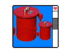 STFB型双筒水封式防爆器属于双罐结构的水封式防爆器,安装在抽放瓦斯泵吸气侧和排气端的管路上,靠防爆器底部的水封保护井上井下、抽放泵站设备及用户安全;当瓦斯抽放时气体经由进气弯管进入水中,然后从水中析出,经出气弯管排除,由水封将进、出气管路隔离;当一端发生爆炸时,在水封的隔离下不能形成连贯爆炸,此时泄压装置的胶板被冲开泄压,保护了井上井下、抽放泵站设备及用户安全。